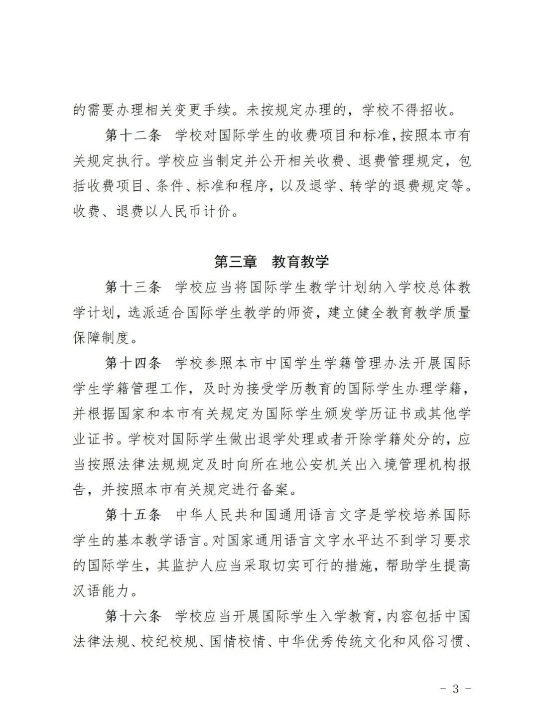 学校对国际学生的收费项目和标准,按照本市有关规定执行。学校应当制定并公开相关收费、退费管理规定,包括收费项目、条件、标准和程序,以及退学、转学的退费规定等。收费、退费以人民币计价。
