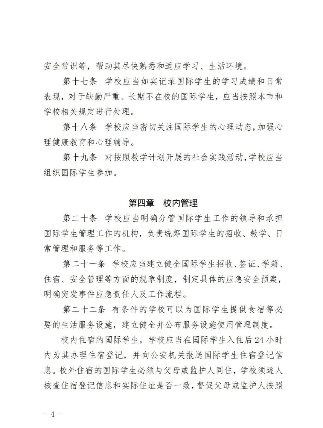 校内住宿的国际学生,学校应当在国际学生入住后24小时内为其办理住宿登记,并向公安机关报送国际学生住宿登记信息。校外住宿的国际学生必须与父母或监护人同住,学校须逐人核查住宿登记信息和实际住址是否一致,督促父母或监护人按照相关法律法规,在国际学生入住后二十四小时内,向居住地公安机关办理住宿登记。