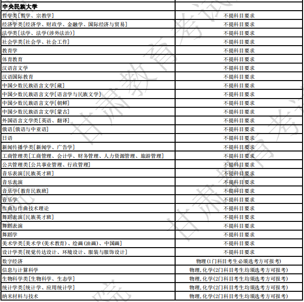 近日,中央民族大学2024年拟在甘肃的招生专业选考科目要求公布,admw360高考复读学校整理了相关信息,分享给同学们参考。详情如下:
