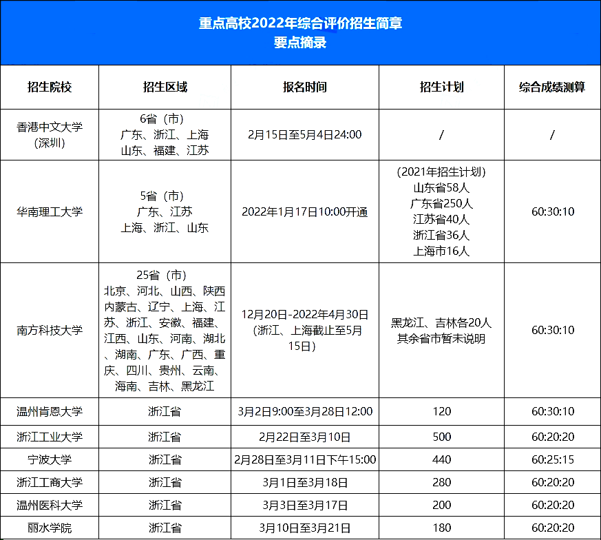 目前,正在报名的综合评价院校共9所,包括面向多省市招生的香港中文大学(深圳)、华南理工大学、南方科技大学,及面向浙江招生的浙江工业大学、宁比大学、浙江工商大学、温州医科大学、丽水学院、温州肯恩大学。