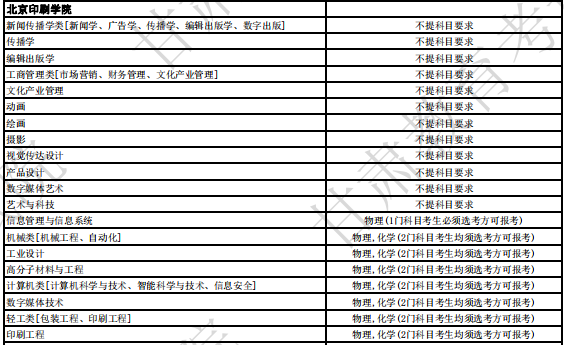 | 10015 | 北京印刷学院 | 轻工类 | 包装工程、印刷工程 | 本科 | 物理,化学(2门科目考生均须选考方可报考) | |