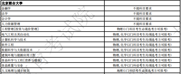 | 北京联合大学 | 电气工程及其自动化 | 本科 | 物理,化学(2门科目考生均须选考方可报考) | ||