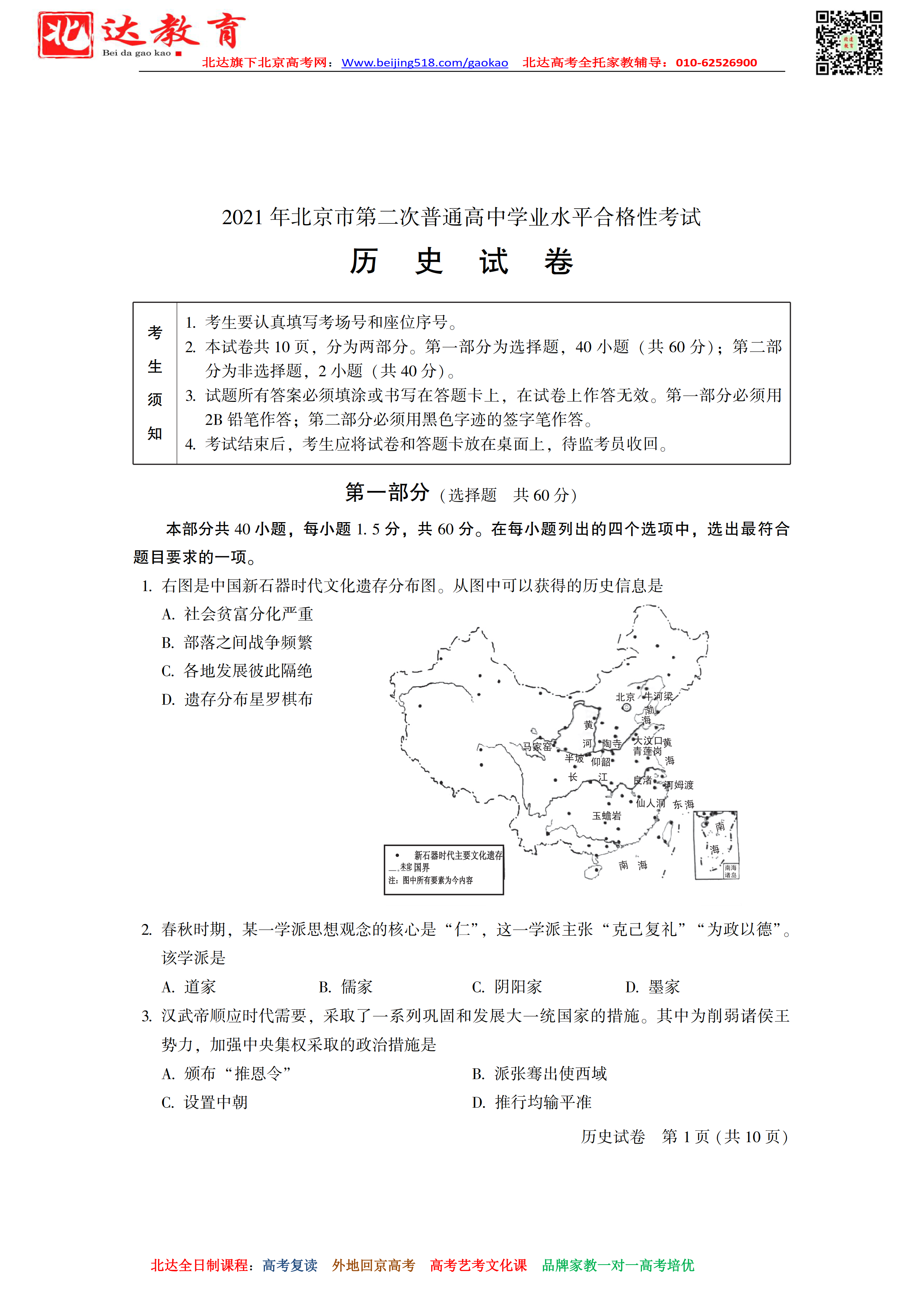 admw360高考复读学校整理了2021年北京第二次普通高中学业水平合格性考试历史试题及答案,分享给大家,希望对大家有所帮助。 admw360高考复读、高考外地回京全日制招生通知 ★2022高考复读全…