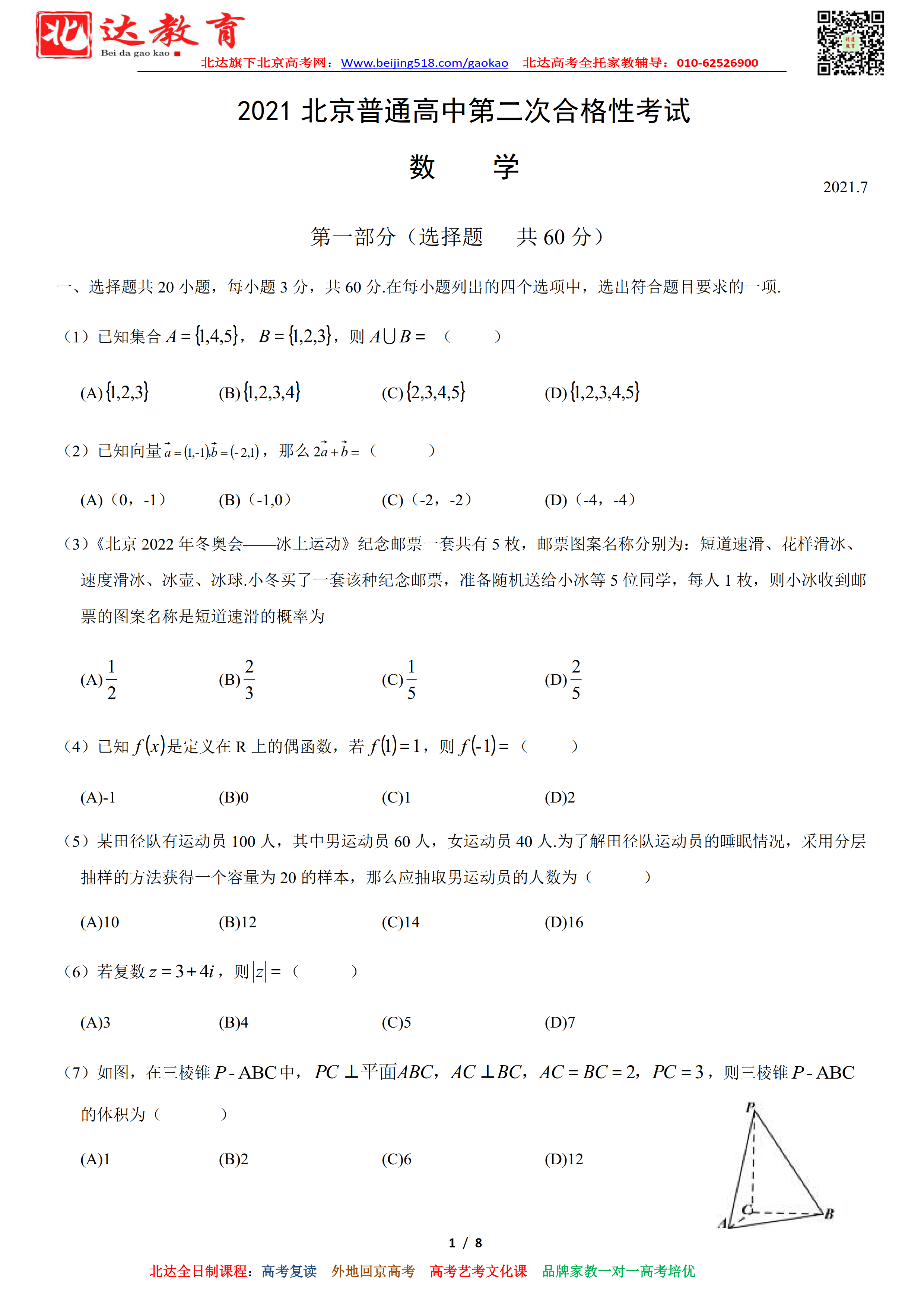 admw360高考复读学校整理了2021年北京第二次普通高中学业水平合格性考试数学试题及答案,分享给大家,希望对大家有所帮助。