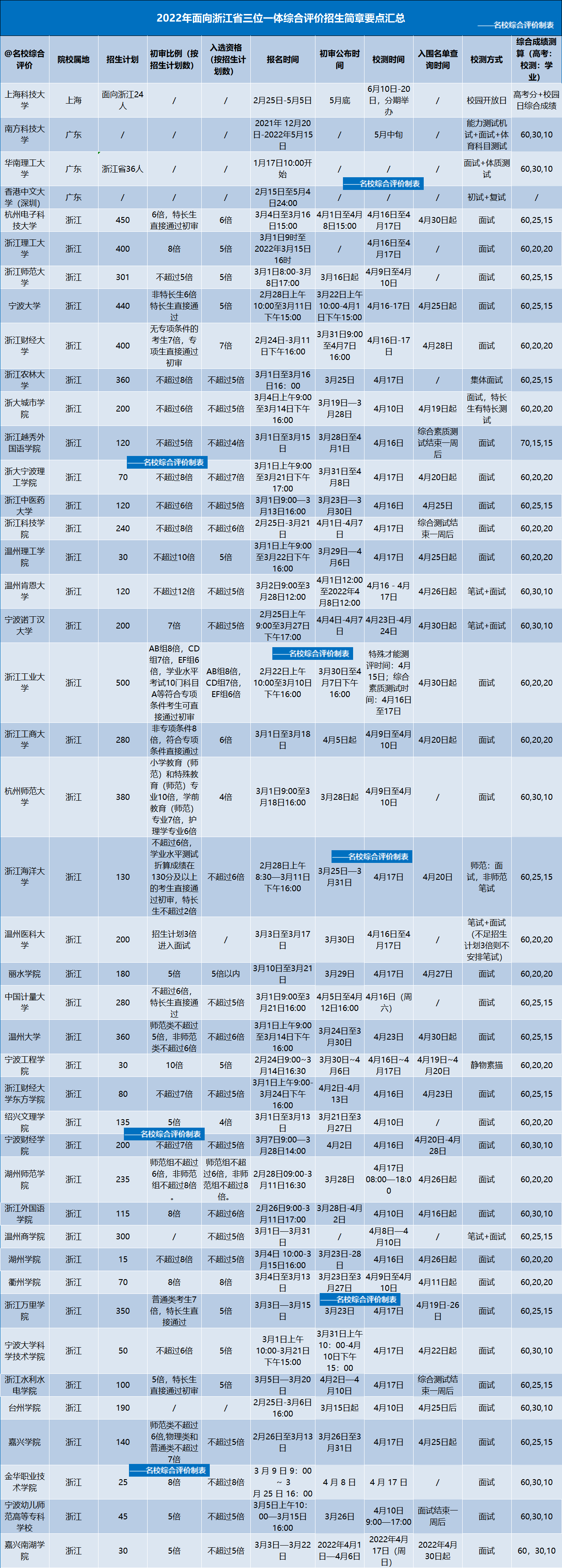 admw360高考复读学校整理了2022年面向浙江省三位一体综合评价招生高校的招生计划、初审比例、入选资格比例、报名时间、初审公布时间、校测时间及入围名单查询时间、校测方式和综合成绩测算方法,以供考生和家长参考: