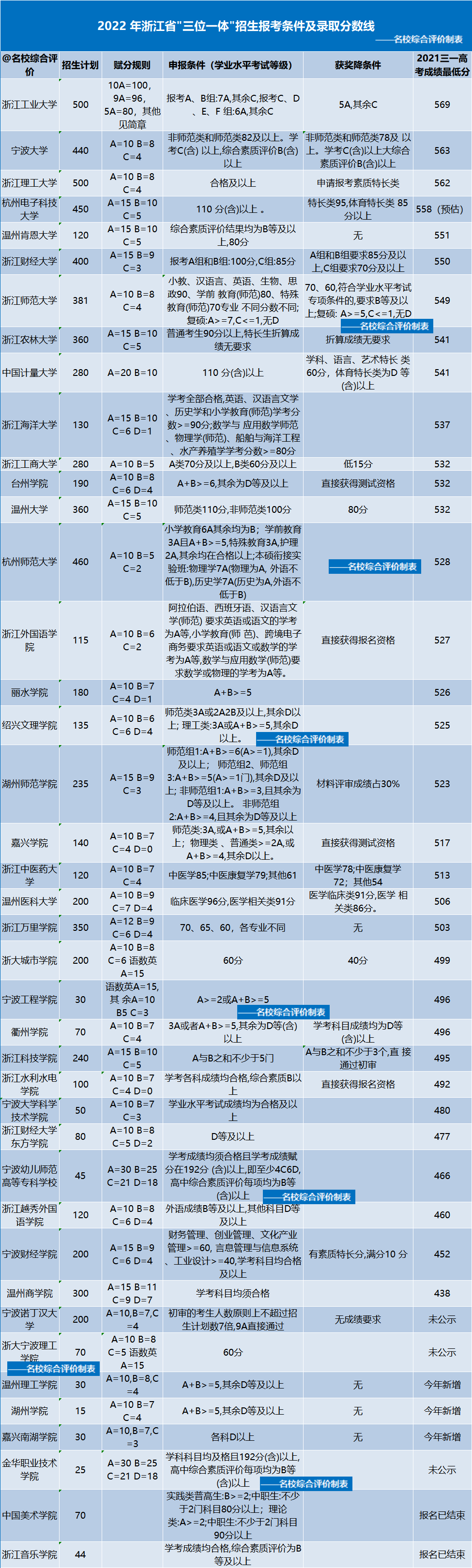 浙江省内三位一体招生高校大多都对考生的学业水平考试等级有相应要求,部分高校如果满足一定条件可直接通过初审。名校综合评价汇总整理了浙江省2022年三位一体学考成绩要求及2021年三位一体高考成绩最低分数线,详情如下。