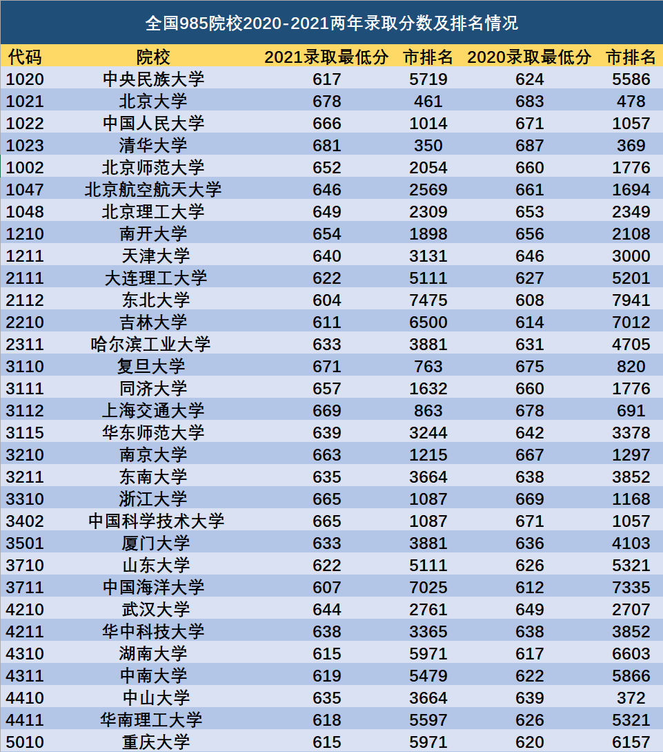 1、整体来看,985高校近两年录取分数变动不大。不难看出,分数线与院校实力息息相关,院校知名度和实力有目共睹。大家可以从地理位置、分数线、专业实力、院校实力、就业方向等角度多方面来考虑择校择专业。