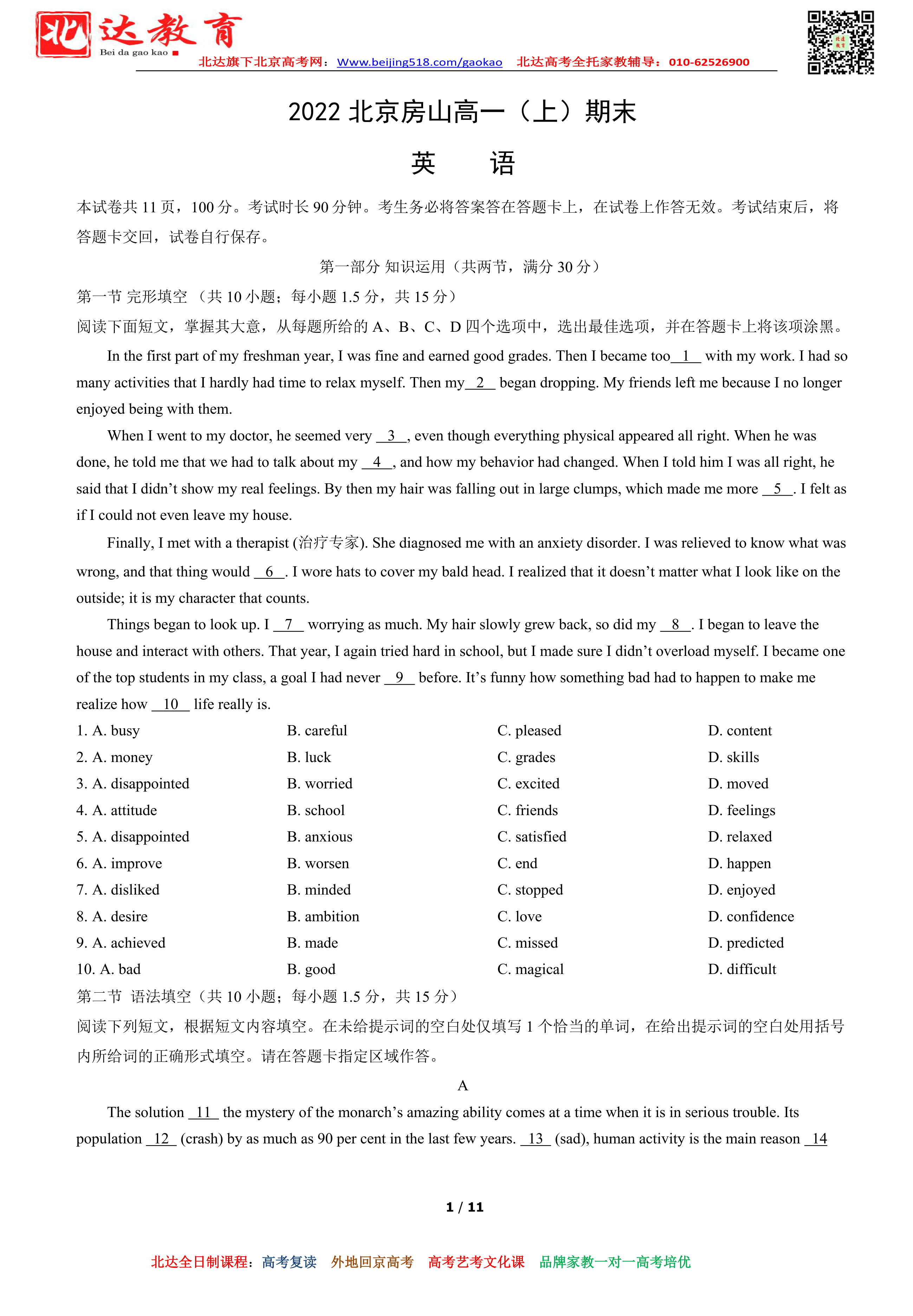 北京房山区2022年高一上学期期末英语试题及答案