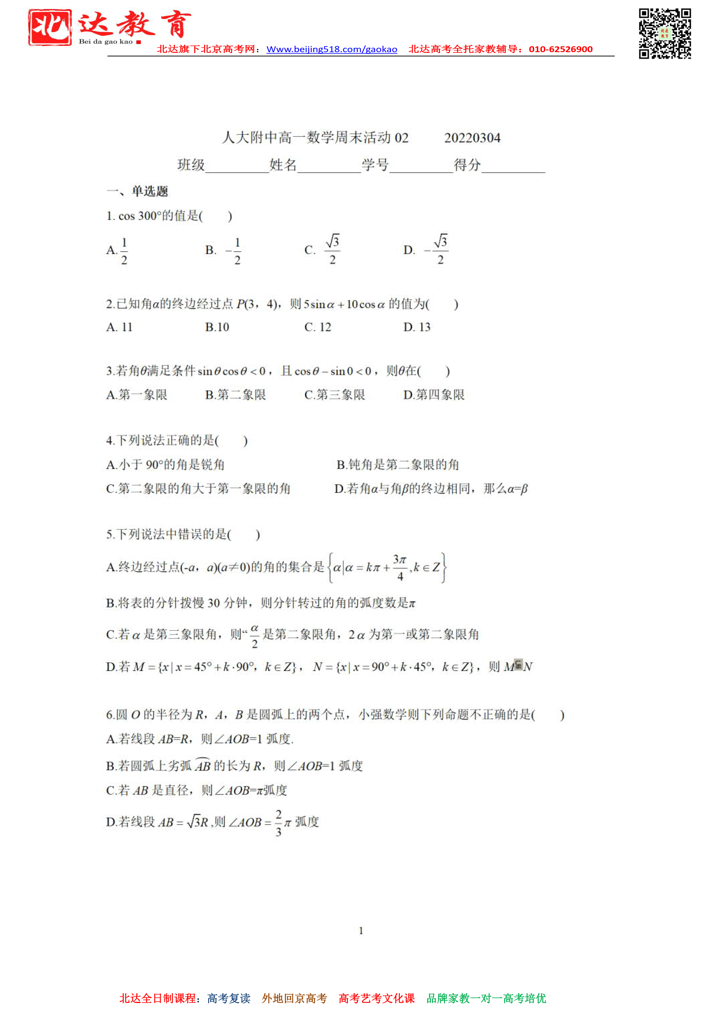 admw360高考复读学校整理了2022.3.4人大附中高一周末数学作业,供大家参考!