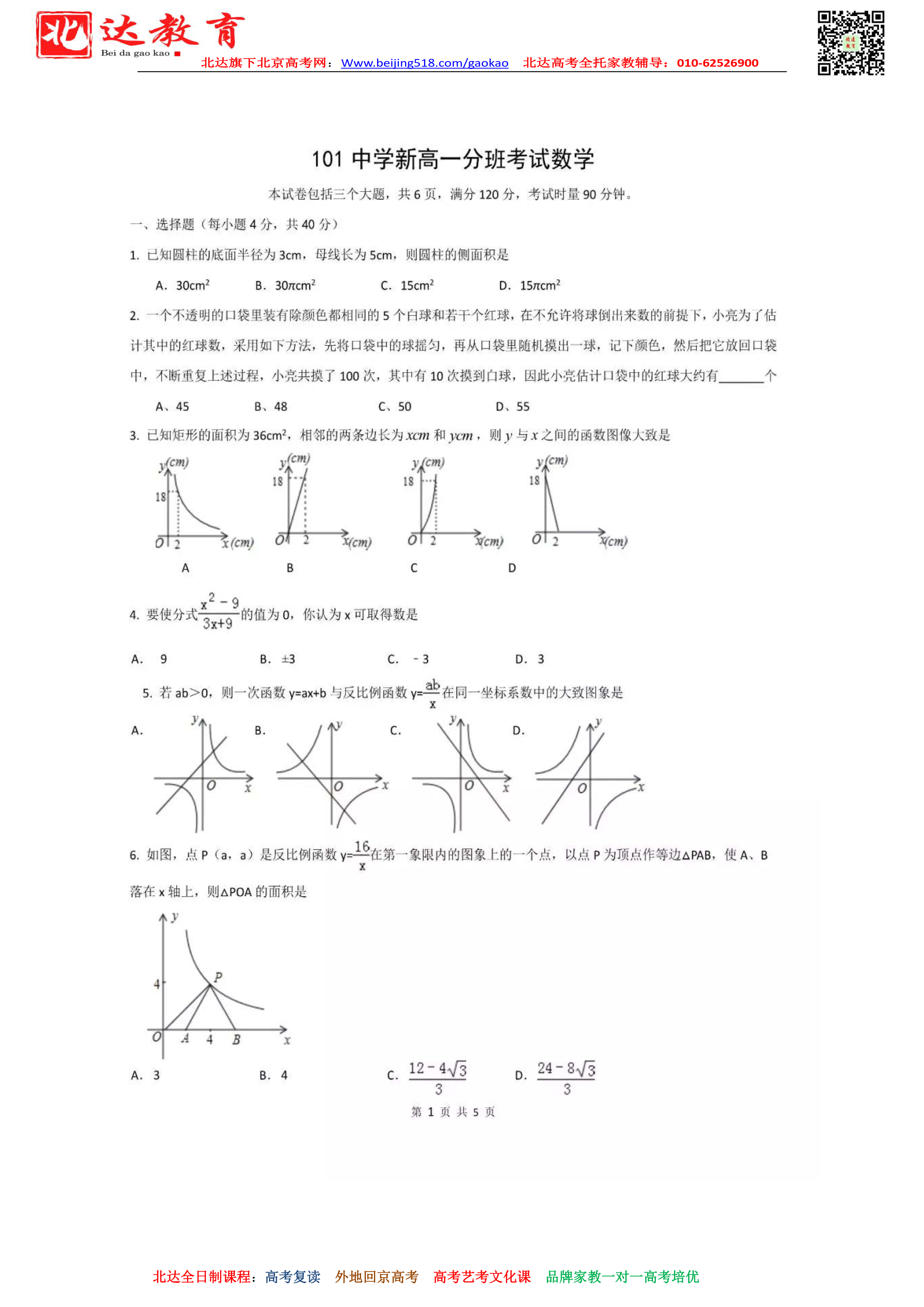 admw360高考复读学校整理了北京市101中学2019届新高一分班考试数学试题,供大家参考!