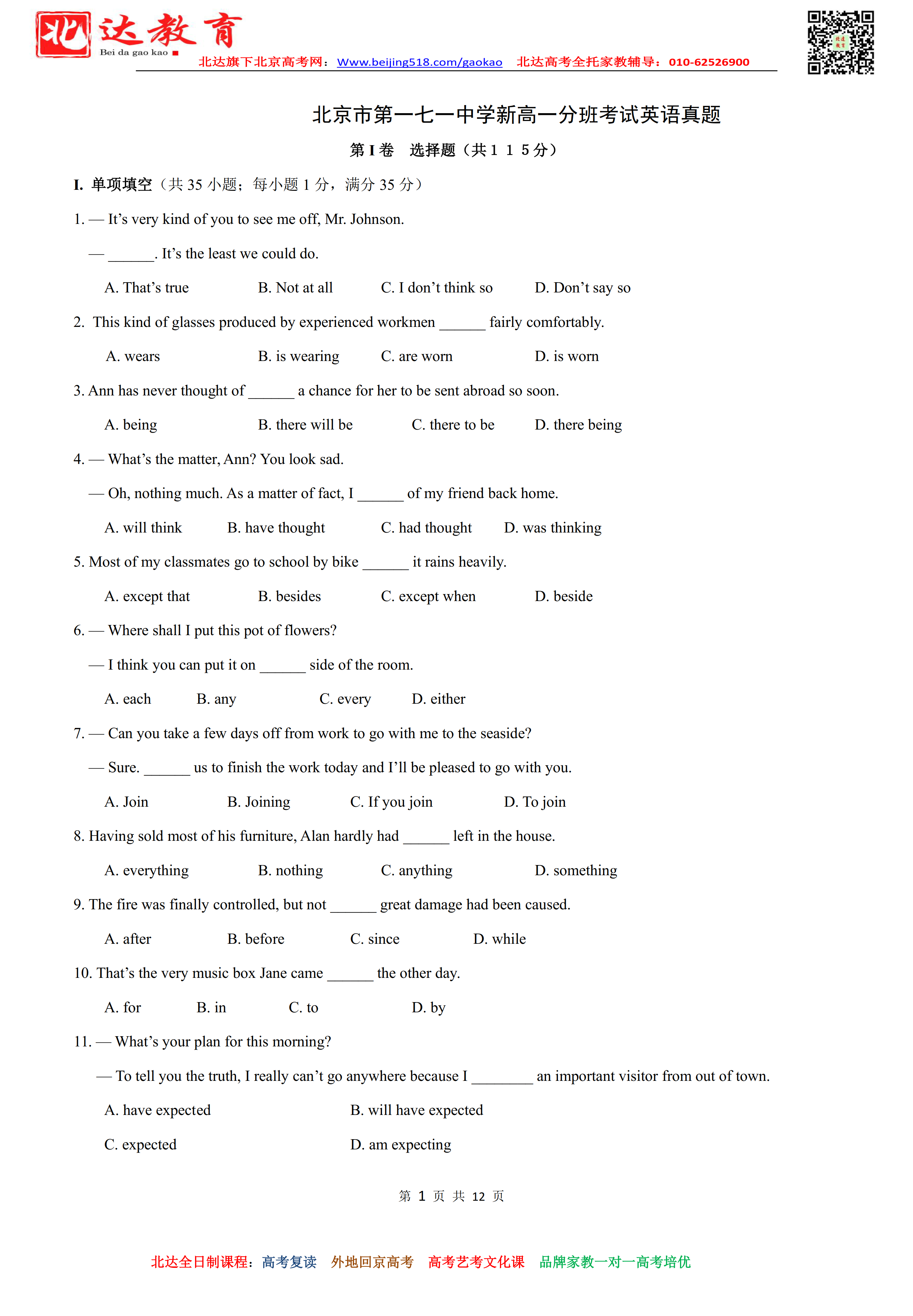 admw360高考复读学校整理了北京市171中学2019年新高一分班考试英语试题及答案,供大家参考! admw360高考复读、高考外地回京全日制招生通知 ★2022高考复读全日制,应届生全日制,外地回…