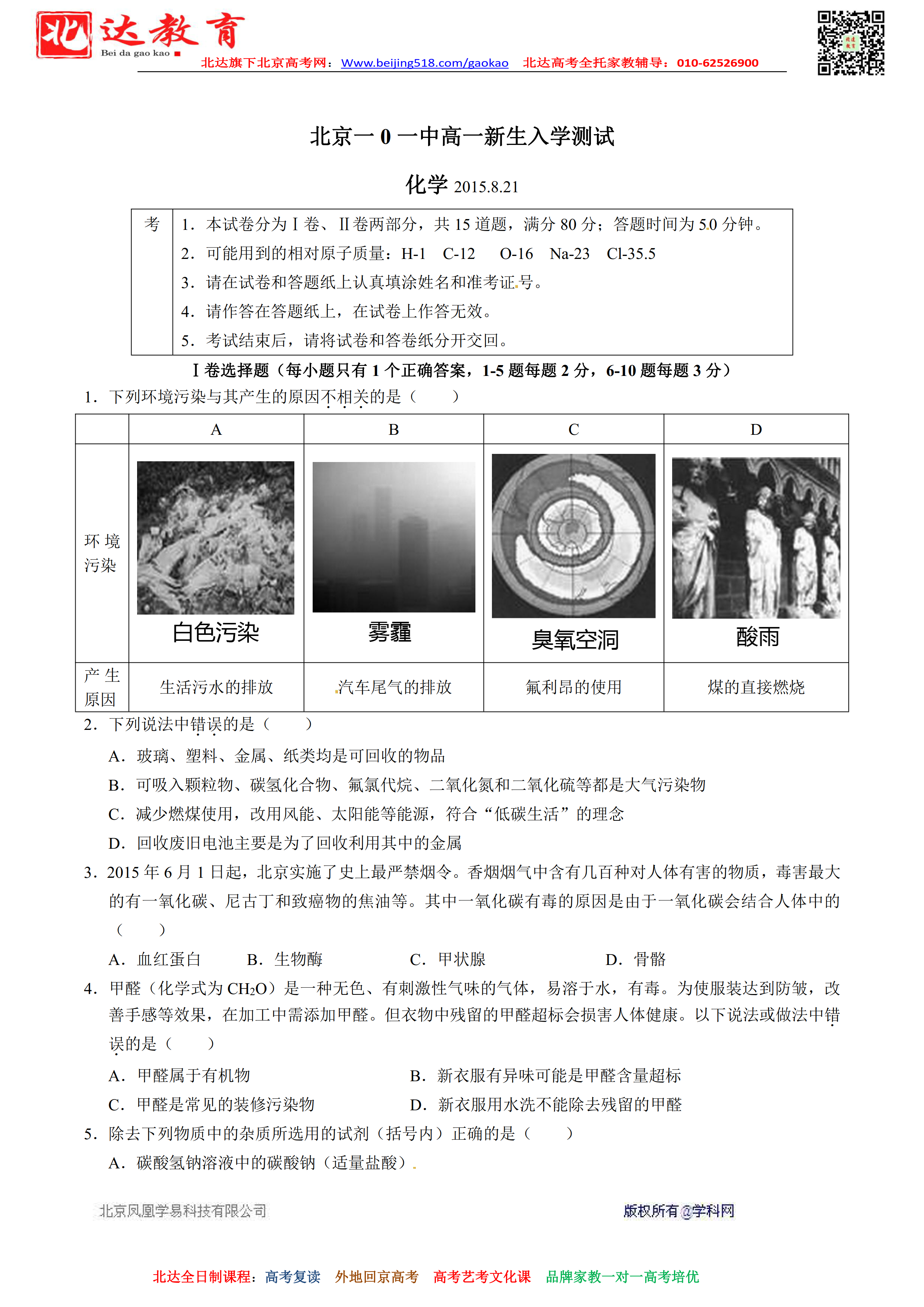 admw360高考复读学校整理了北京一零一中学2015-2016学年高一上学期入学分班考试化学试题,供大家参考!