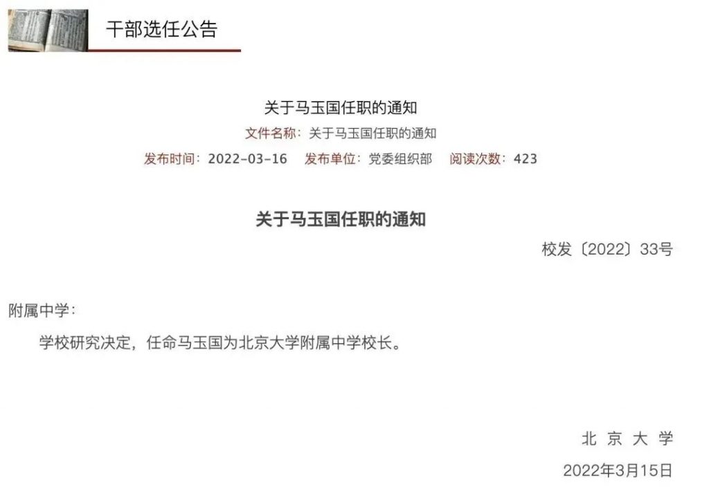 刚刚,备受关注的北大附中新校长定了!在校长职位空缺三个月之后,北大附中迎来了新掌门。昨天(3月15日),北京大学发布干部选任公告,学校研究决定,任命马玉国为北大附中校长。