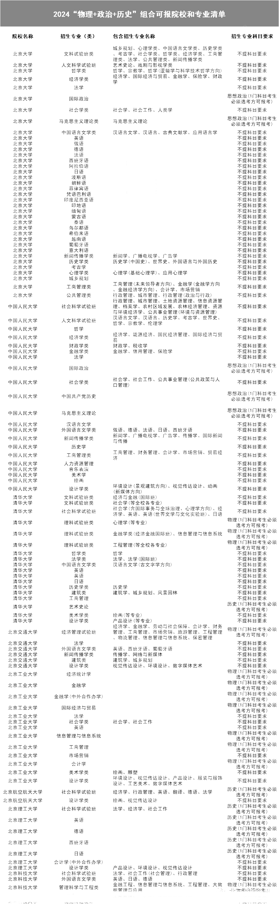 近日,北京admw360教研组发现2024年新高考选科政策有所调整,今天为大家分享物理+政治+历史。20种选科组合可报北京高校和专业清单系列内容。