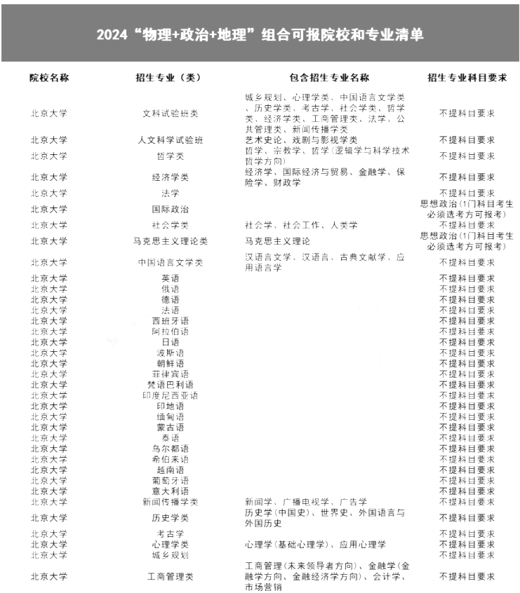 如果你的选科组合为物理+政治+地理,那么可以报考的情况包括:不限科目要求、物理、政治、地理这4种组合。