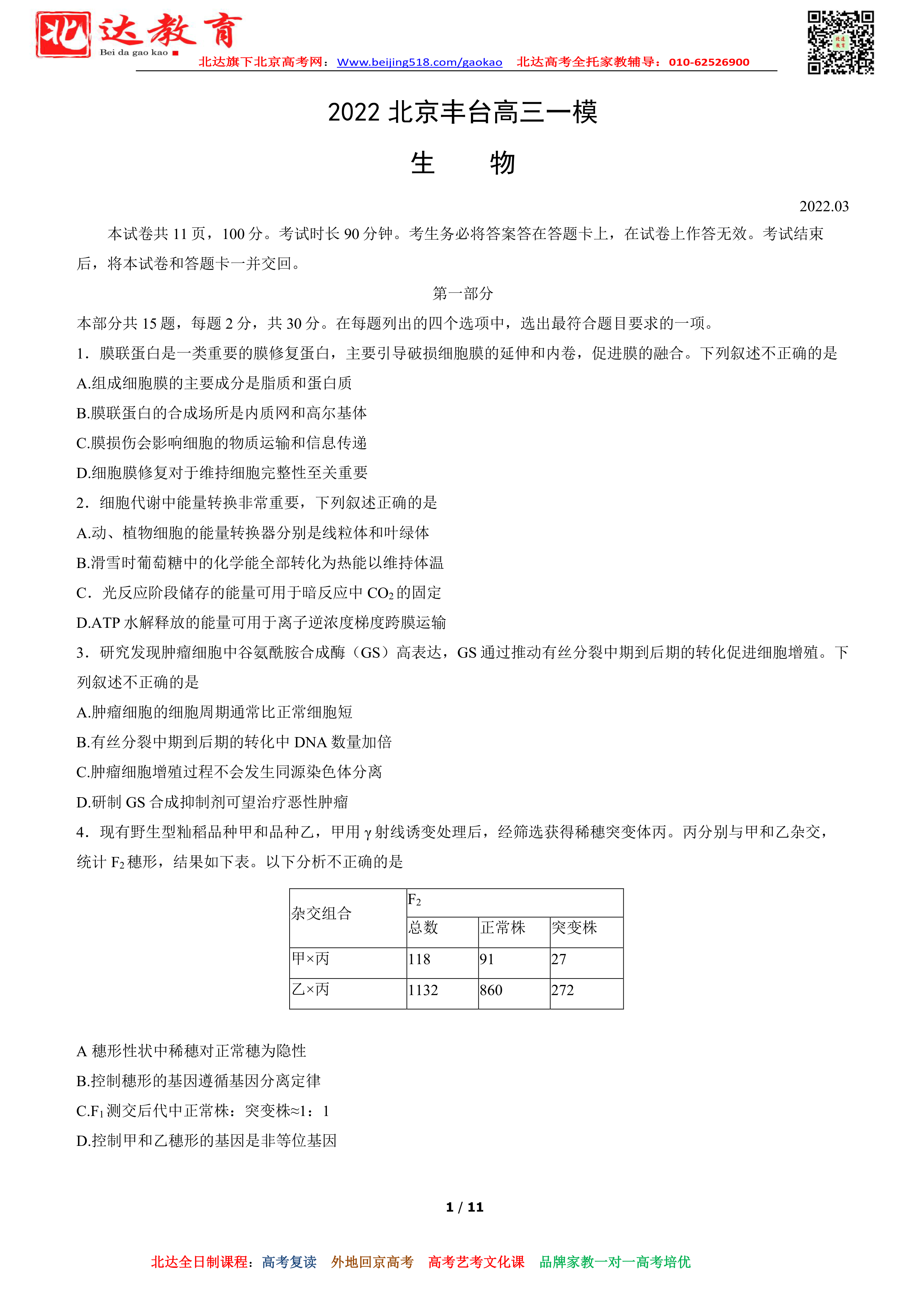 北京丰台区2021-2022学年高三一模生物试题及答案