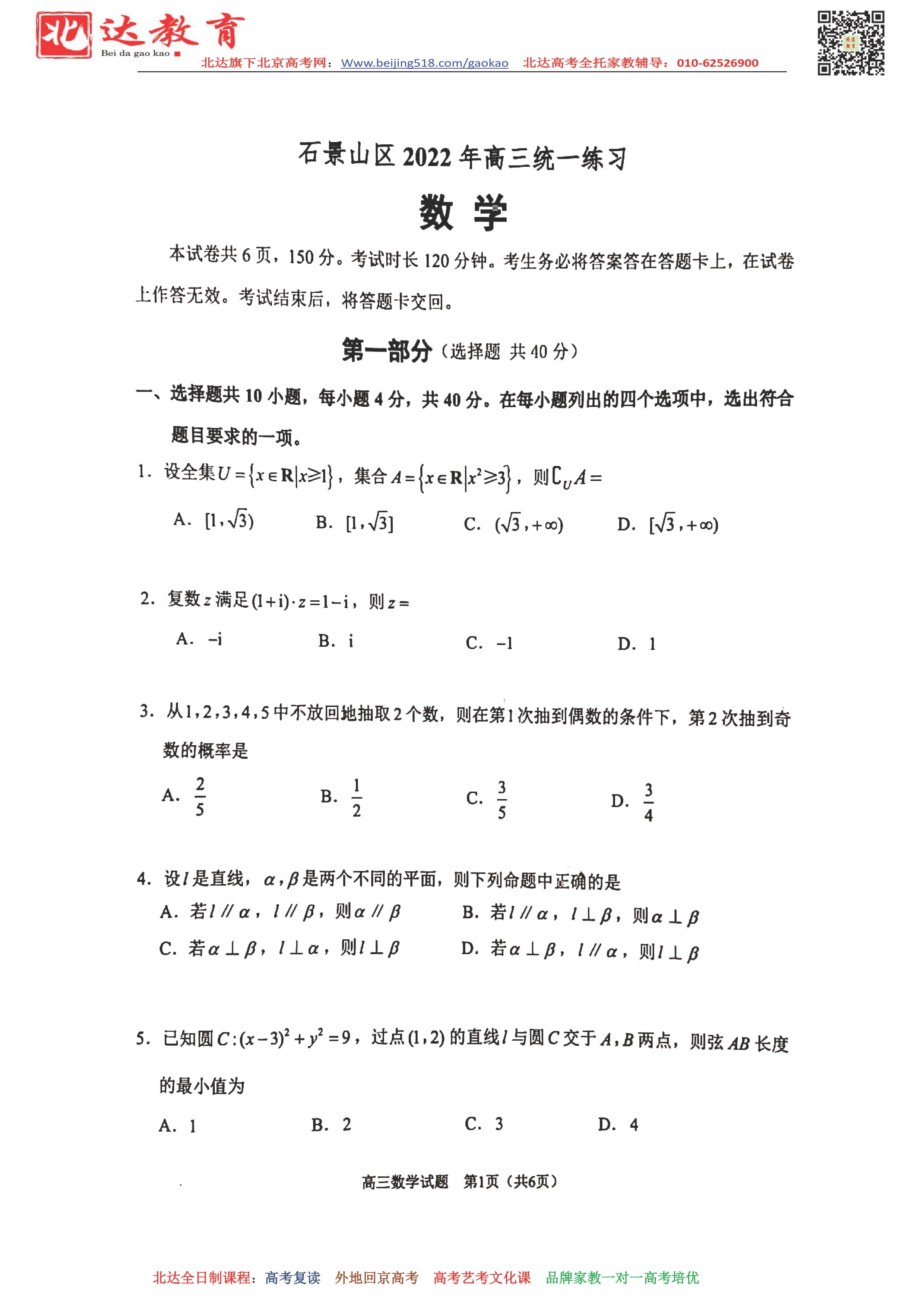 根据安排,3月28日-30日,2022年北京石景山举行高三一模考试,一模在形式和题量上更接近高考,因此同学们要格外重视,为了方便同学们下载复习,北京高考复读学校跟进相关试题,详情如下。