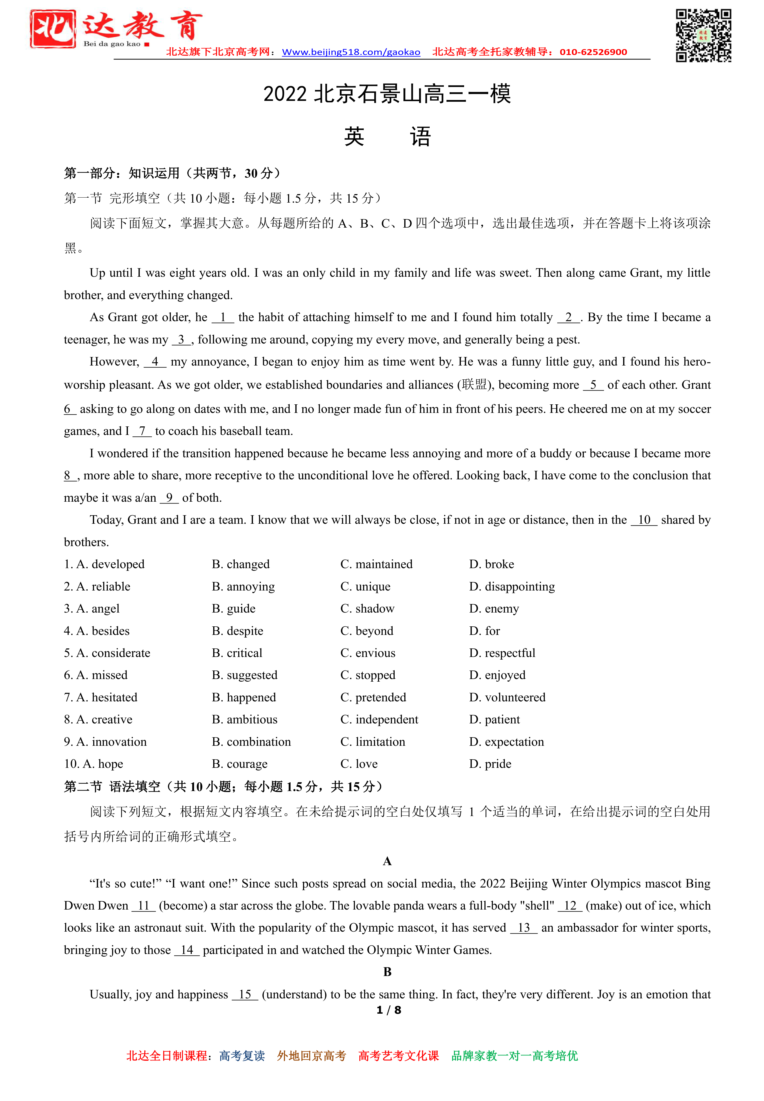 首页 taptap点点 北京石景山2021-2022学年高三一模英语试题及答案
