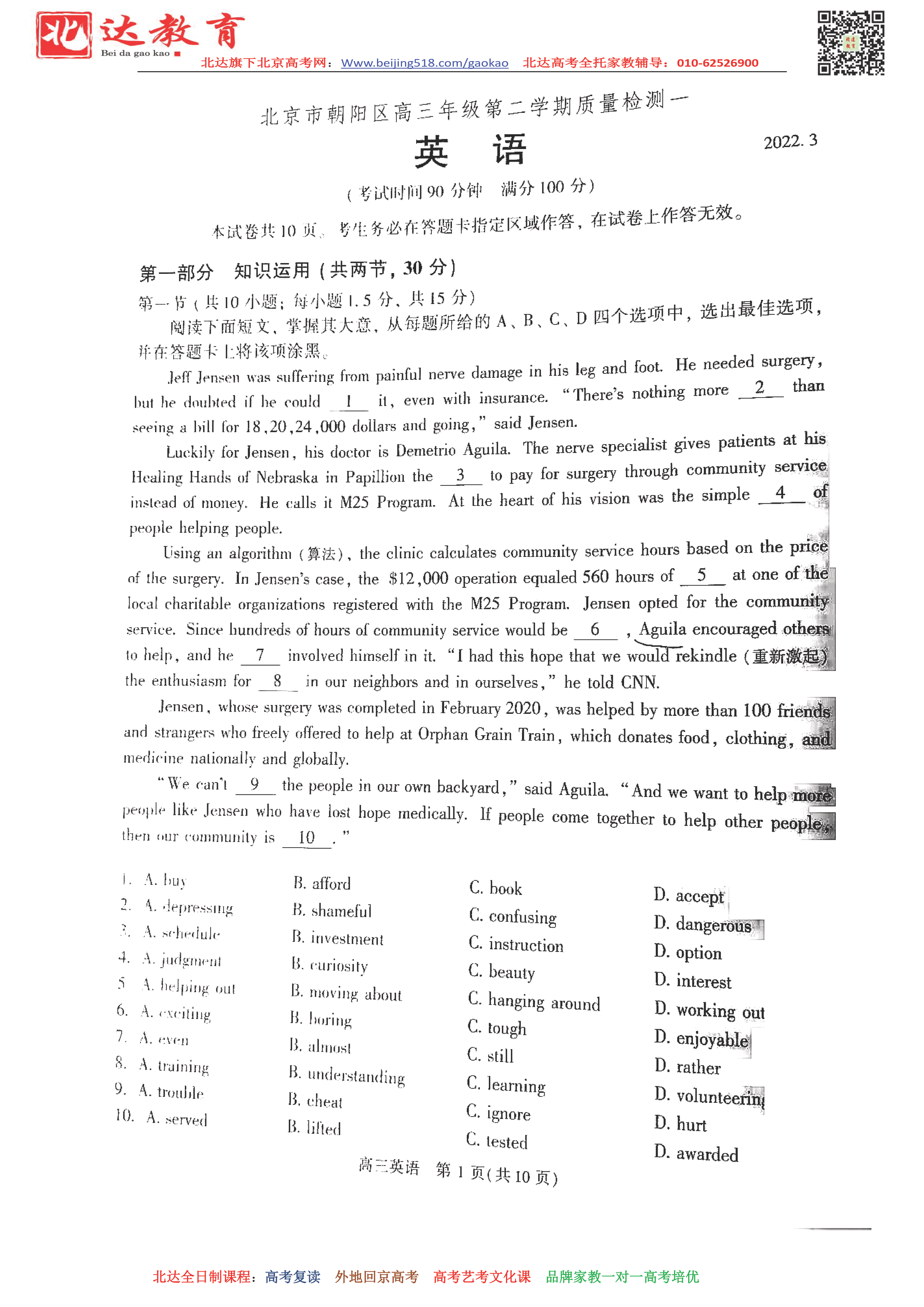 北京朝阳区2021-2022学年高三一模英语试题及答案