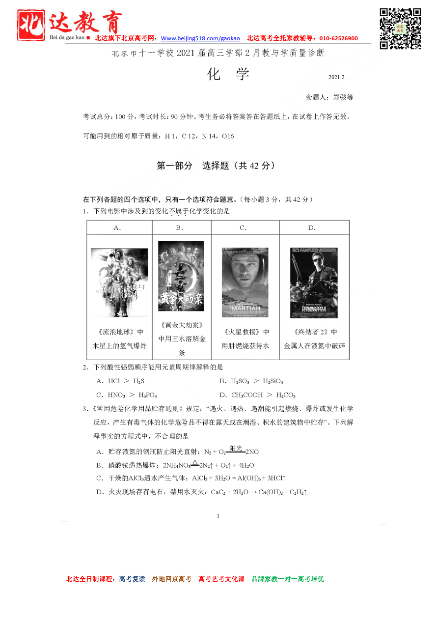 为了方便同学们下载复习,北京高考复读学校为大家整理了2021北京市十一中学高三2月教与学质量诊断化学试题并附上答案,需要的同学赶紧下载吧。