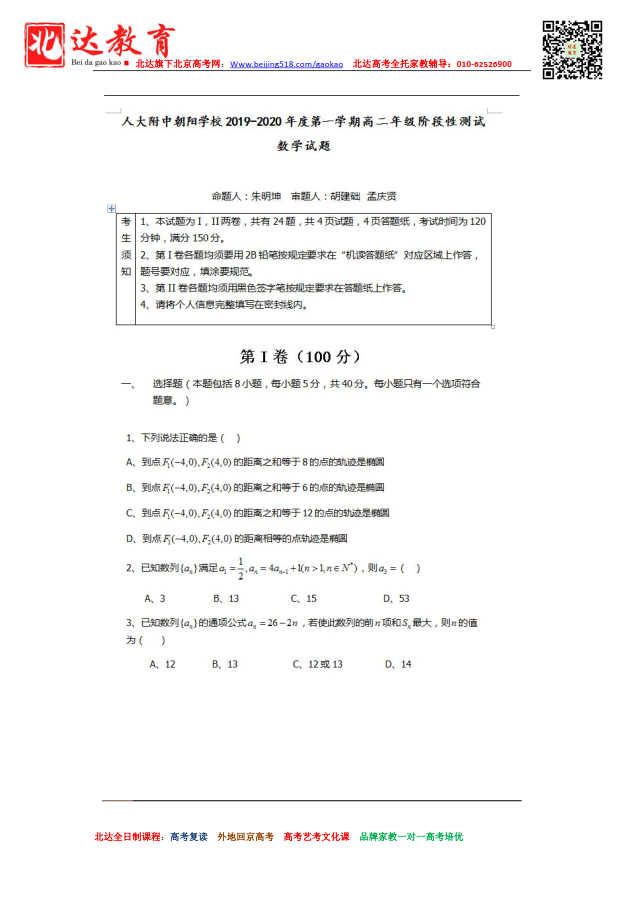 北京admw360教研组为大家整理了人大附中朝阳学校2019-2020第一学期高二阶段性测试数学,需要的小伙伴赶紧下载吧。