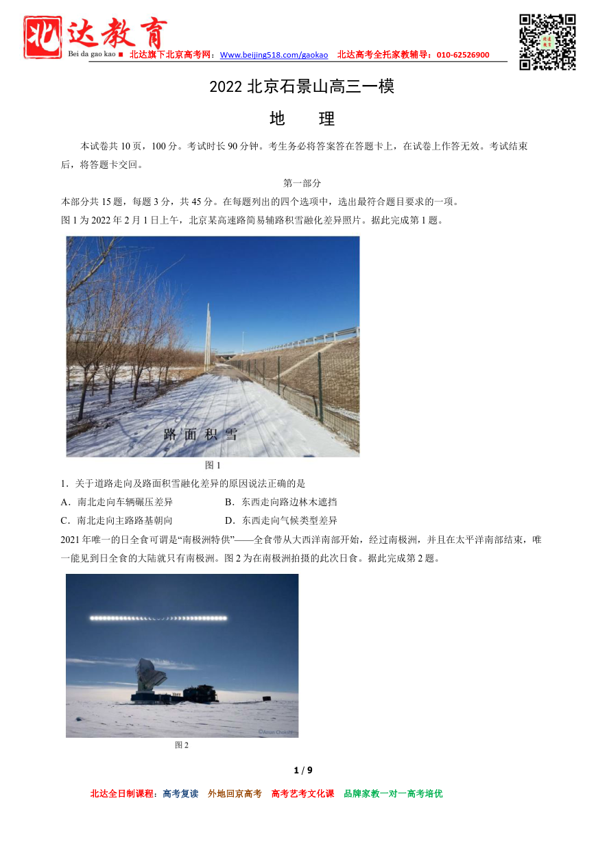 北京石景山区2021-2022学年高三一模地理试题及答案