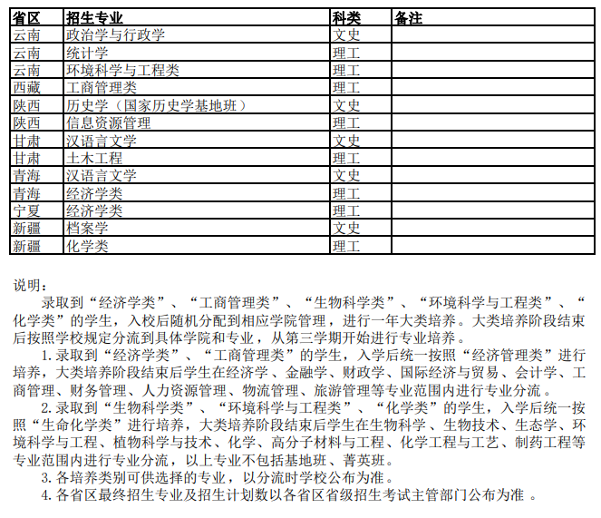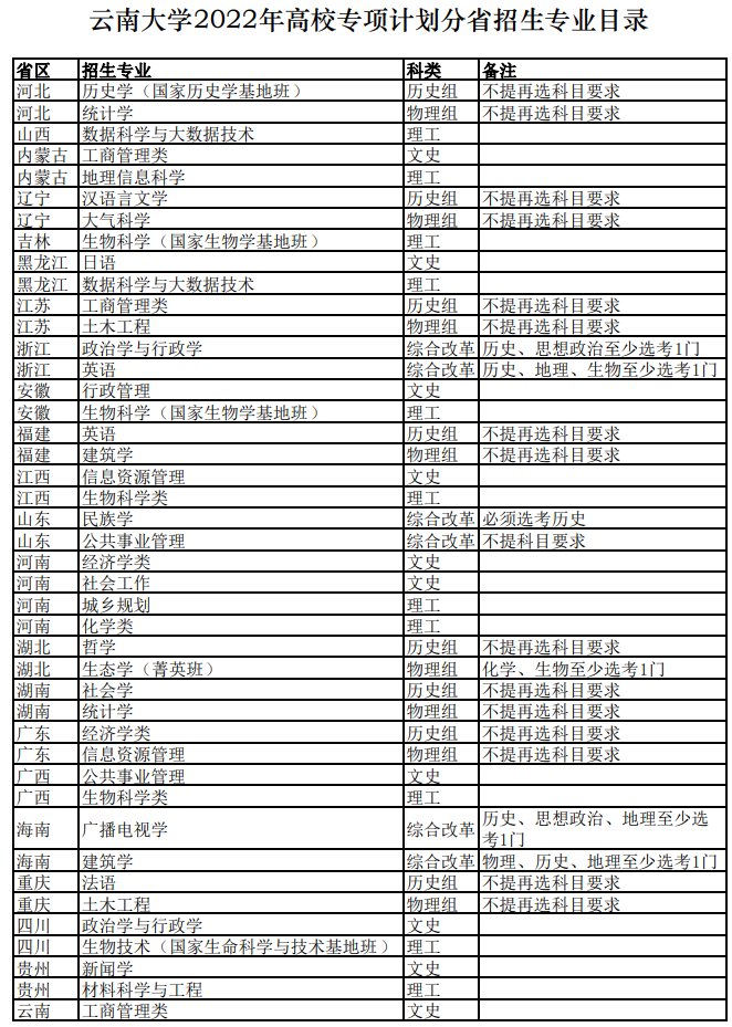 2.2022年招生计划90名,招生专业详见附件《云南大学2022年高校专项计划分省招生专业目录》,分省招生计划参照各省(区、市)报名考生比例分配。各省实际招生专业及计划数以生源地省级招生考试部门公布为准。