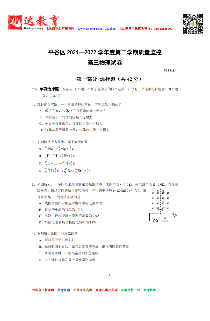 北京平谷区2021-2022学年高三一模物理试题