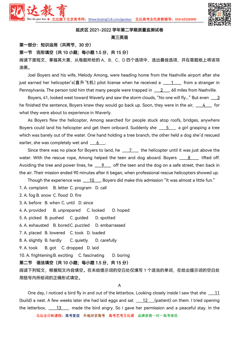 北京延庆区2021-2022学年高三一模英语试题及答案