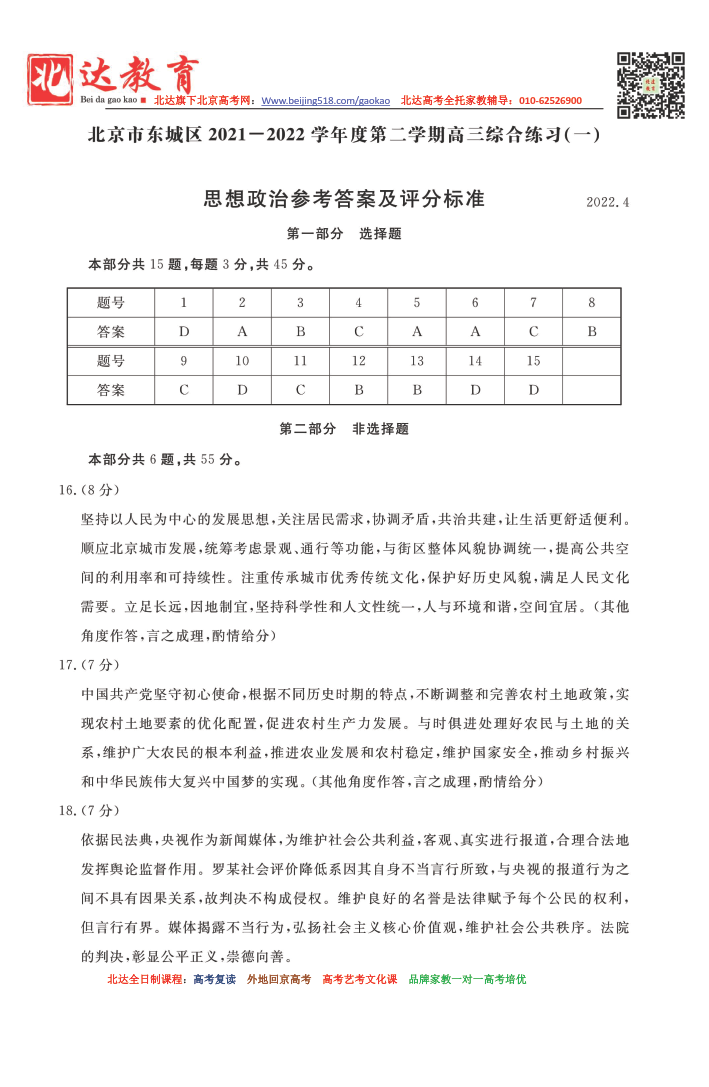 北京东城区2021-2022学年高三一模政治试题答案