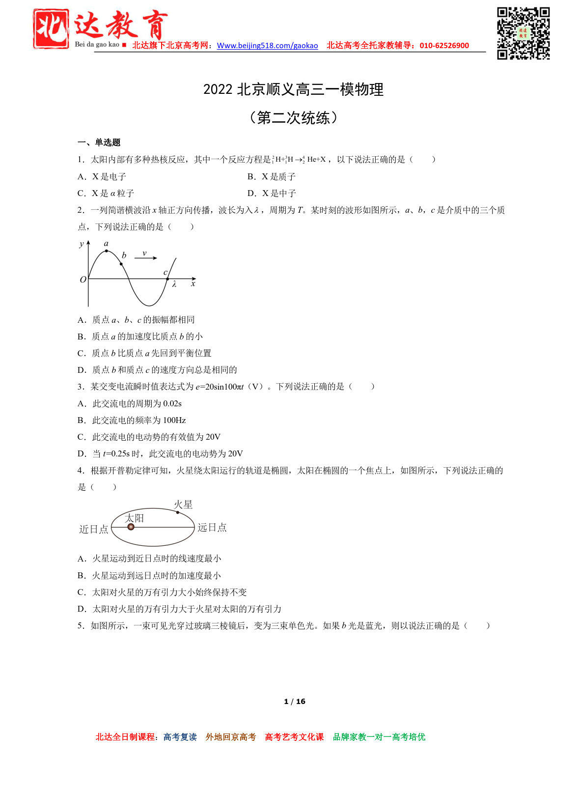 北京顺义区2021-2022学年高三一模物理试题及答案