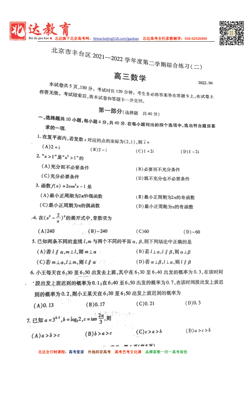 2022年北京丰台区高三二模考试一开始,二模在形式和题量上更接近高考,因此同学们要格外重视,为了方便同学们下载复习,北京高考复读学校跟进相关试题,详情如下。