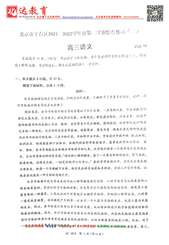 2022年北京丰台区高三二模考试一开始,二模在形式和题量上更接近高考,因此同学们要格外重视,为了方便同学们下载复习,北京高考复读学校跟进相关试题,详情如下。
