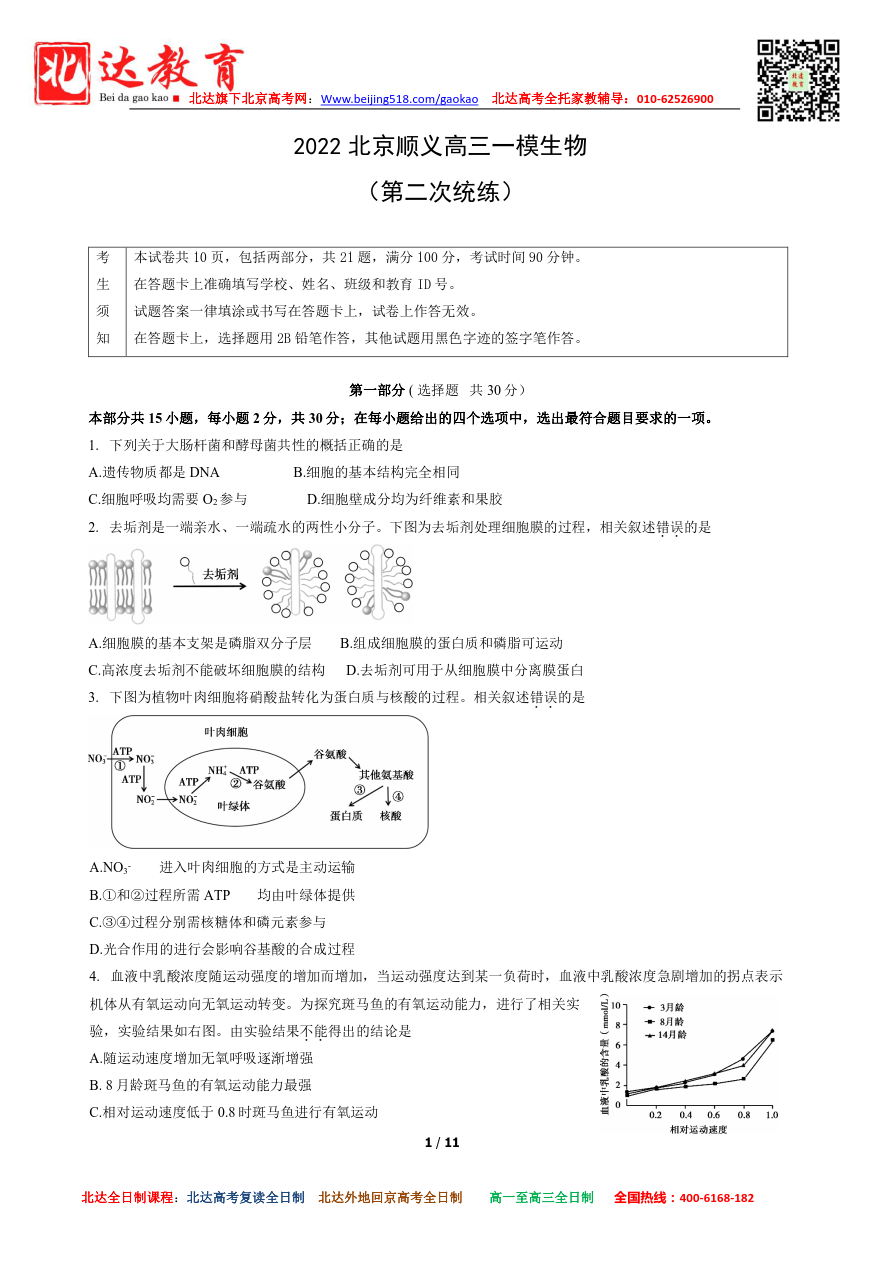 北京顺义区2021-2022学年高三一模生物试题及答案