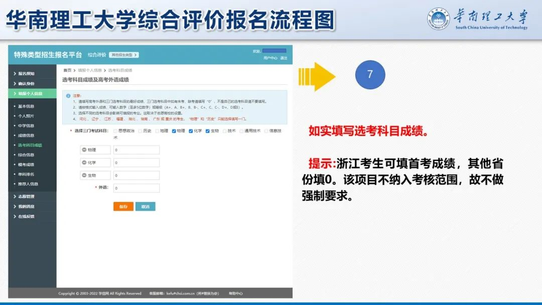 例如华南理工大学官方发布的报名流程图里,明确说明除了浙江省考生可以填写首考成绩以外,其他省份考生填“0”。该项目不纳入考核范围,所以不做强制要求。