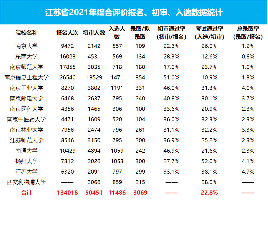 1、2021年江苏省内综合评价院校中,除西交利物浦大学未统计到外,13所高校报名人次共计13万+,14所高校初审人数5万+,入选人数11486人,最终拟录取人数3069人,总体考试通过率在22.8%。