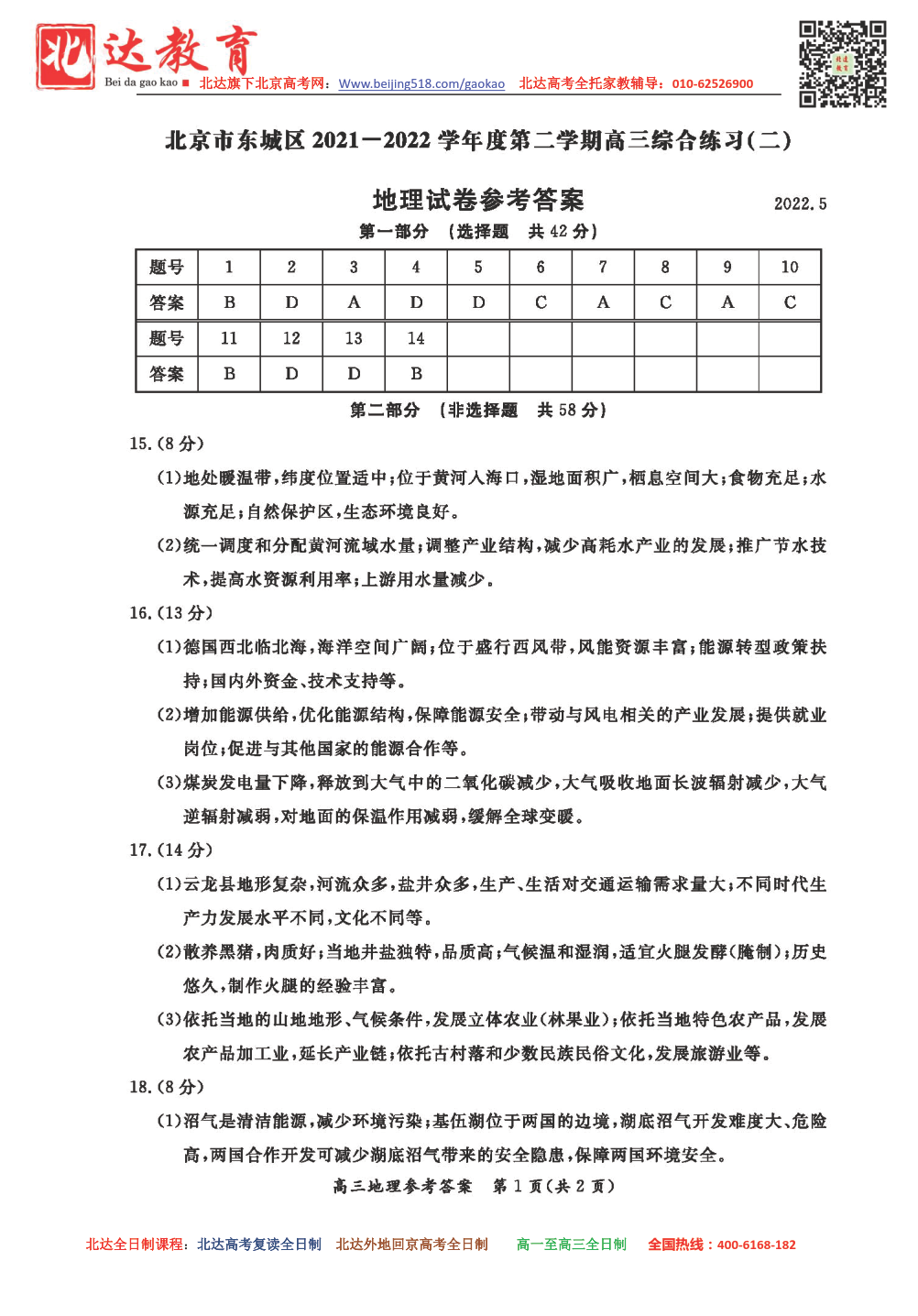 北京东城2021-2022学年高三二模地理试题答案