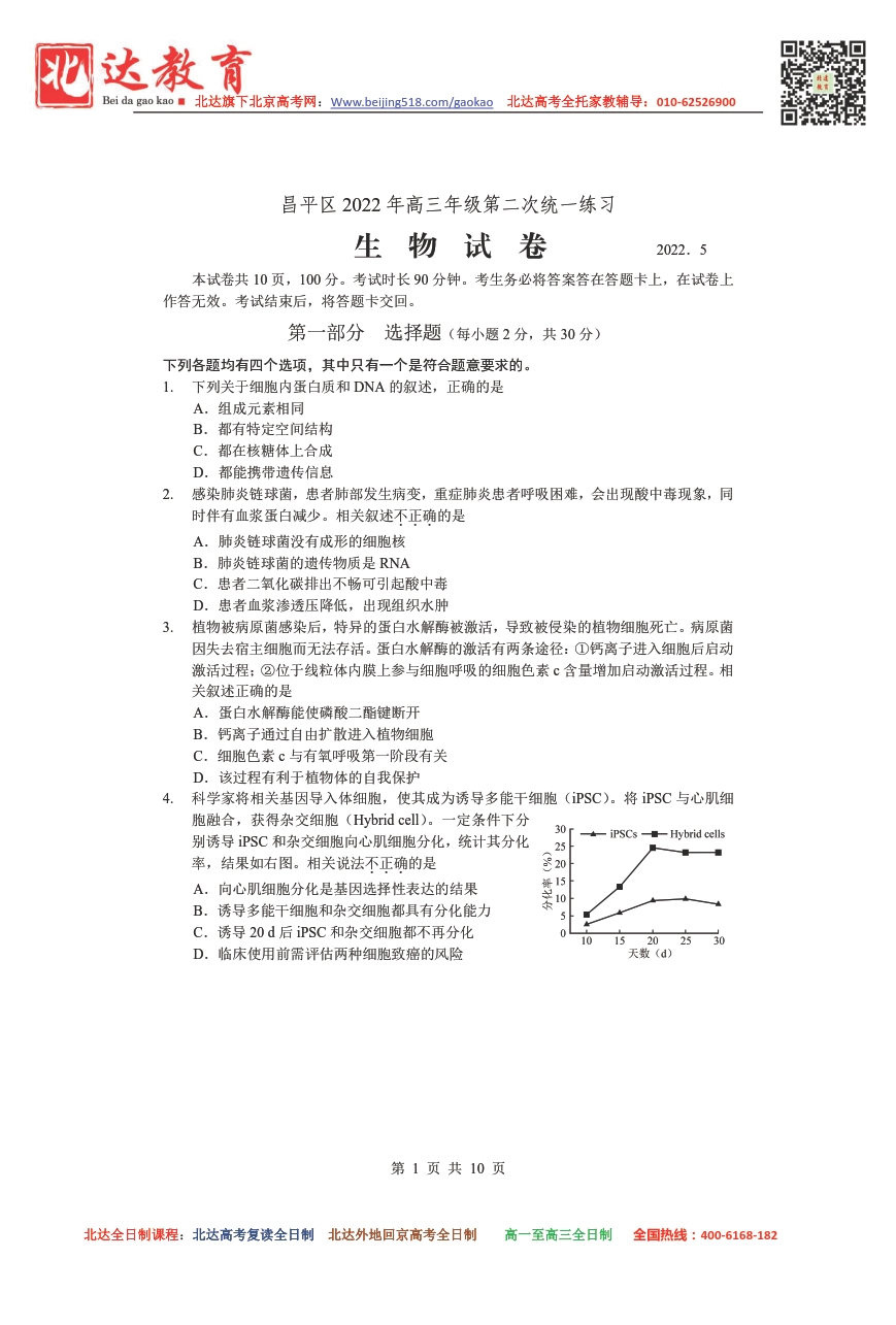 北京昌平区2021-2022学年高三二模生物试题及答案