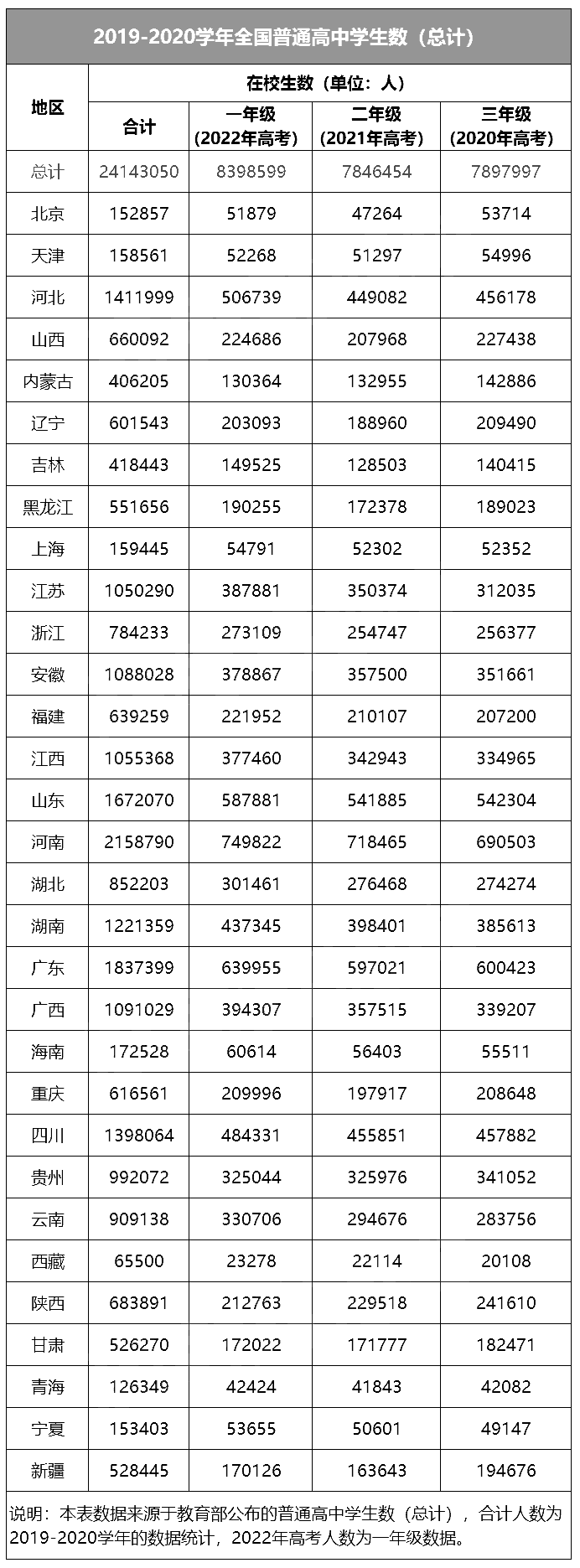 其他省市大多尚未公布2022年高考报名人数!那么,今年高考人数到底有多少?我们可以从此前教育部公布的2019-2020年度全国普通高中学生数(总计)中了解到一些情况。从统计的数据来看,2020届-2022届全国普通高中在校生人数都是在800多万左右。