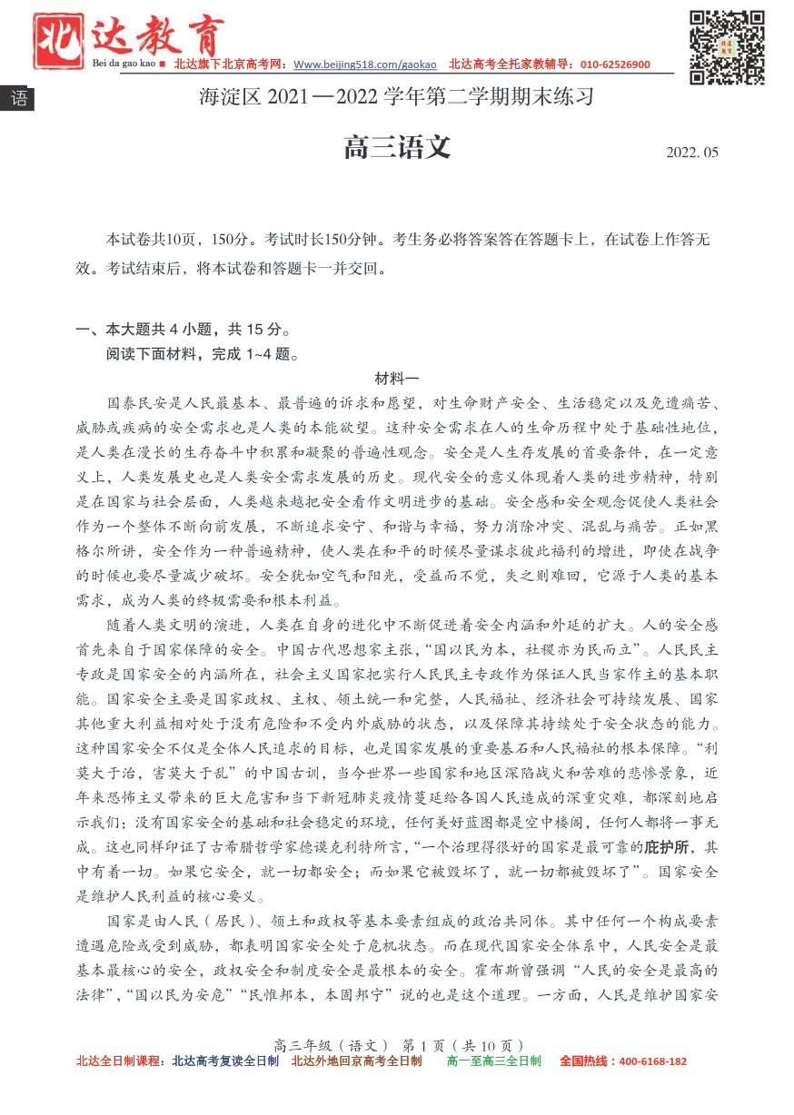 2022年北京海淀区高三二模考试已开始,二模在形式和题量上更接近高考,因此同学们要格外重视,为了方便同学们下载复习,北京高考复读学校跟进相关试题,详情如下。