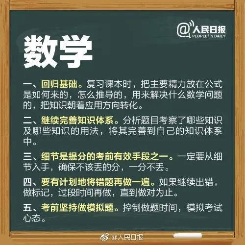 数学:重选择,选择分值更大;重基础题,基础题千万不能错;重时间安排,选填三四十分钟为佳。推荐两天做一套卷子,保持手感。