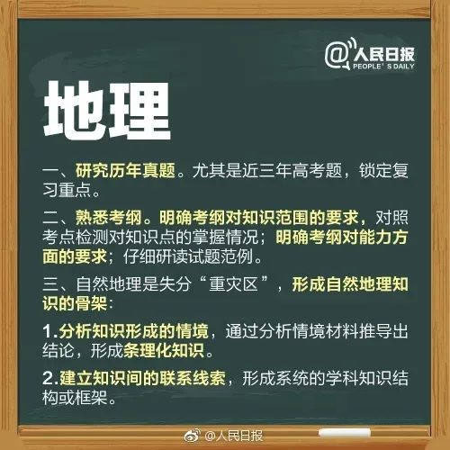 理综(物化生):重选择,选择分值太大;重时间安排,根据自身情况定;物理重思维,化学重易错点,生物重知识点记忆。