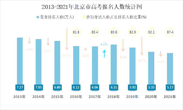注:2020年有关北京市高考报名人数没有明确数据说明,49225人为该年北京市统一高考的考生人数,上图数据是根据高考升学网中提到2021年北京高考总人数比2020年减少1738人推算得出。