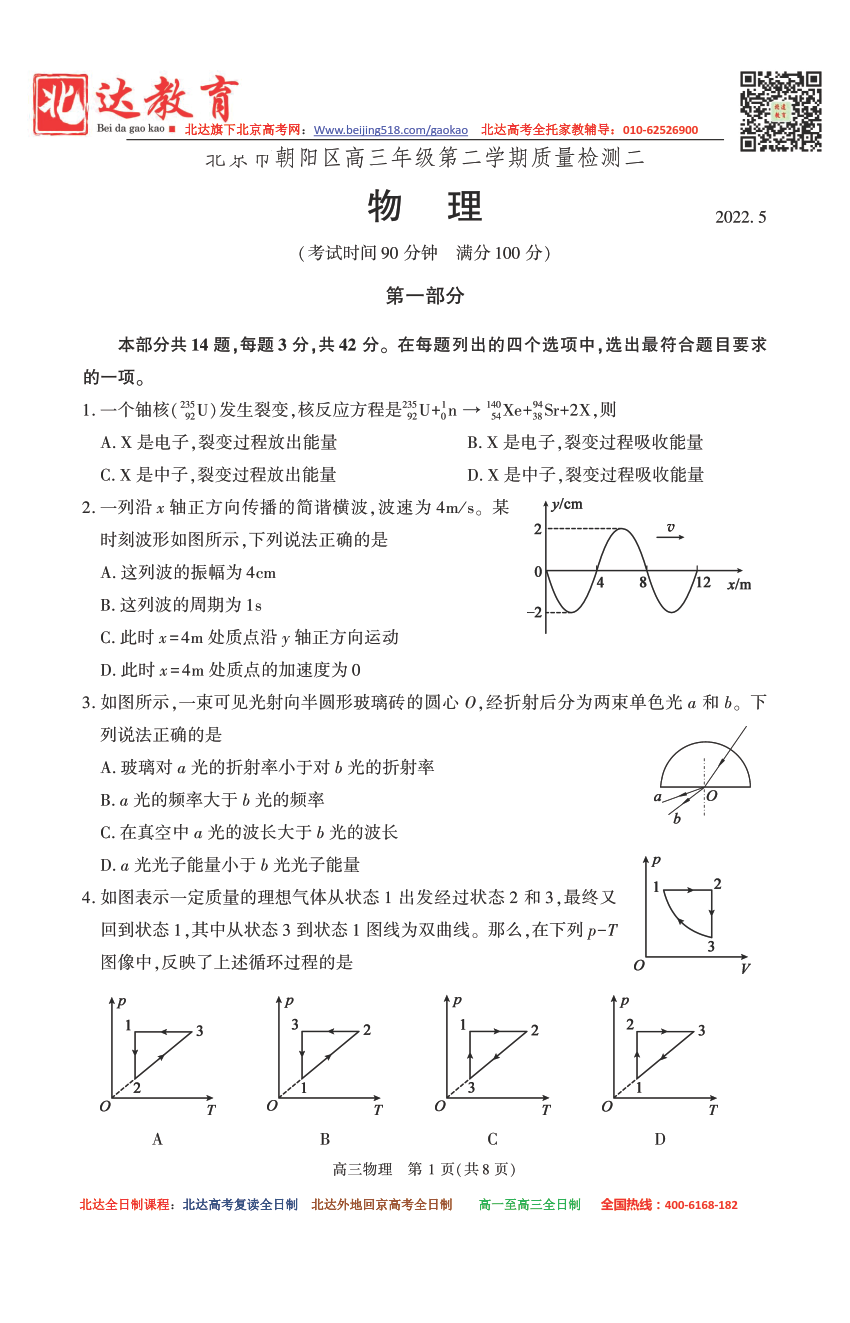 北京朝阳区2021-2022学年高三二模物理试题及答案