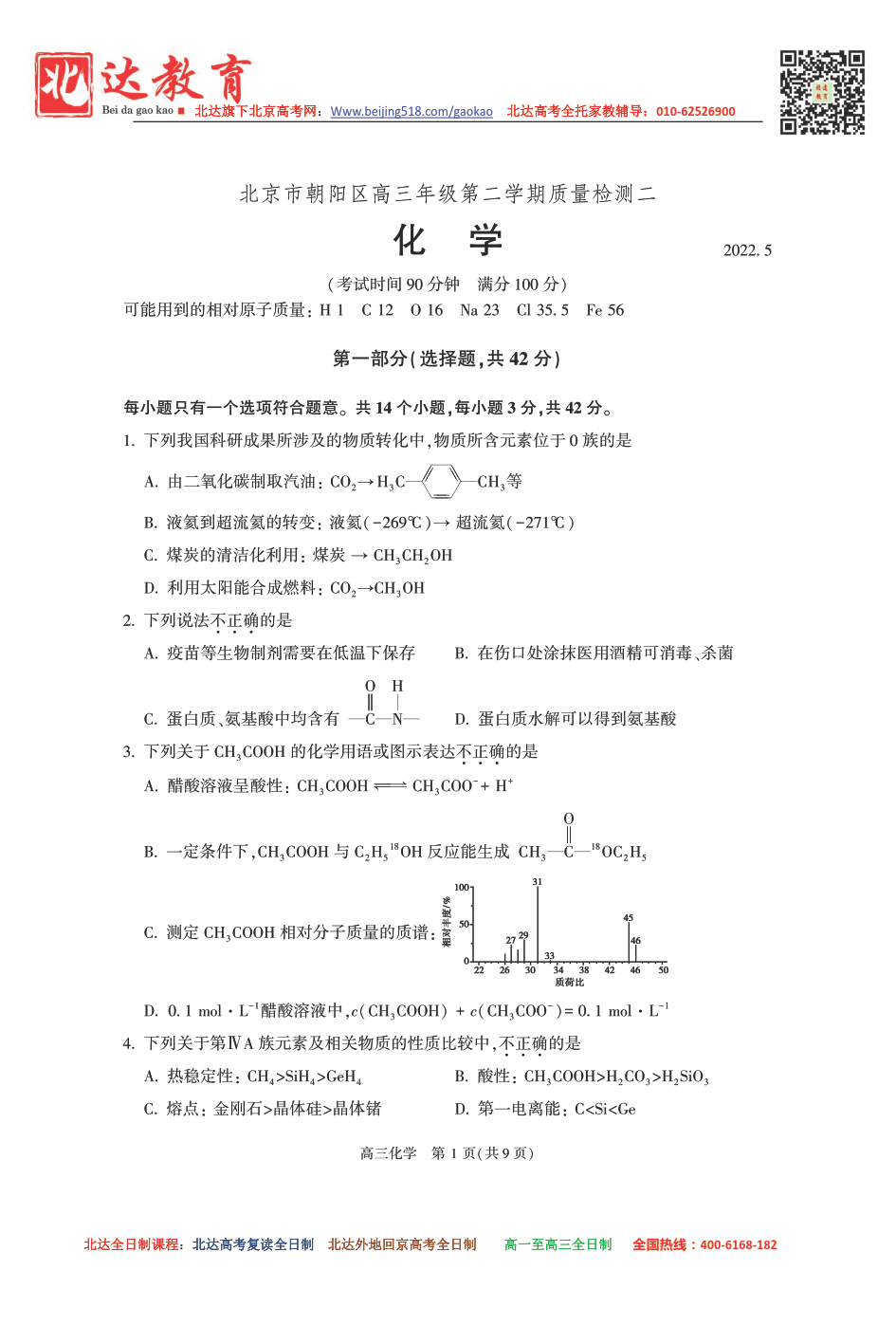 北京朝阳区2021-2022学年高三二模化学试题及答案