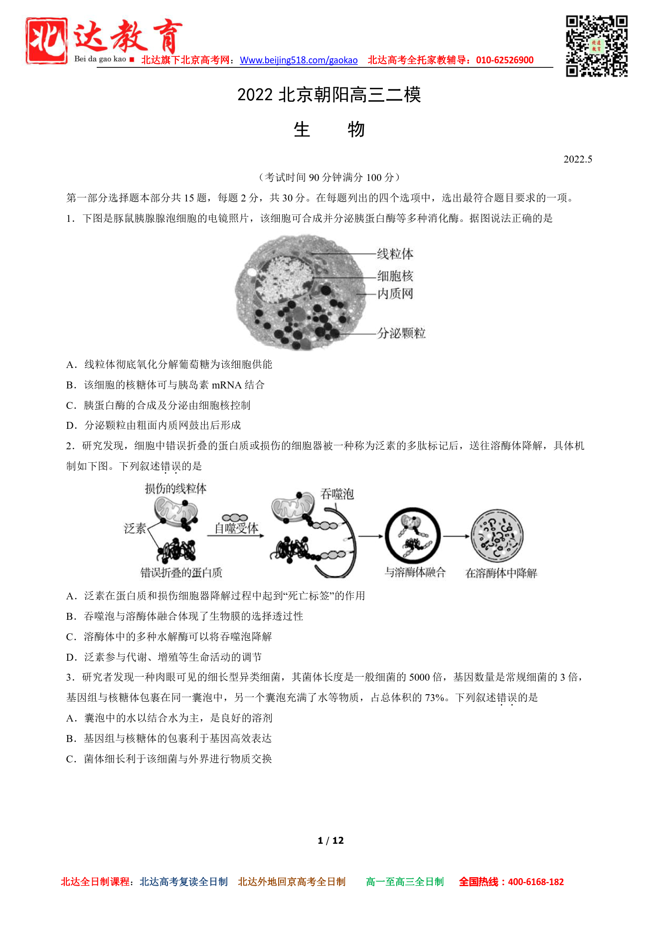 2022年北京朝阳区高三二模考试已开始,二模在形式和题量上更接近高考,因此同学们要格外重视,为了方便同学们下载复习,北京高考复读学校跟进相关试题,详情如下。 admw360高考复读、高考外地…