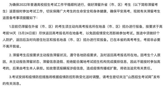- 山西:滞留外省(市、区)考生尽快返晋备考