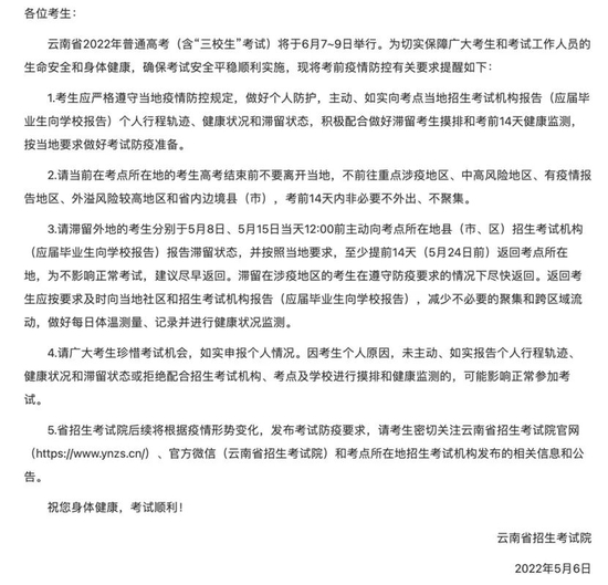 - 云南:考前14天内非必要不外出、不聚集