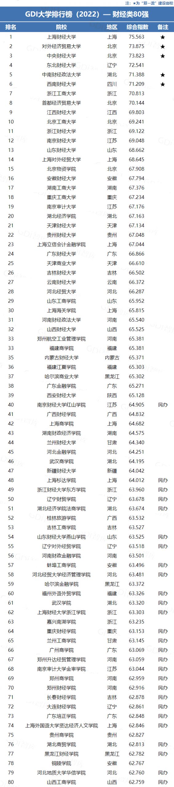 在“GDI大学排行榜(2022)— 财经类80强”中,上海财经大学、对外经济贸易大学、中央财经大学位居前三,东北财经大学、中南财经政法大学分列第四、第五。