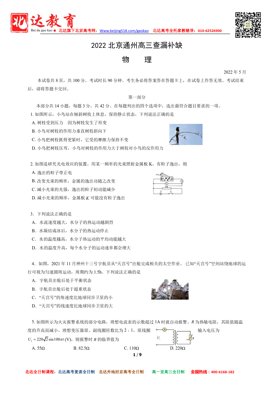 近日,北京admw360复读学校为大家整理了北京通州区2021-2022学年高三二模【查漏补缺】物理试题及答案汇总。详情如下。